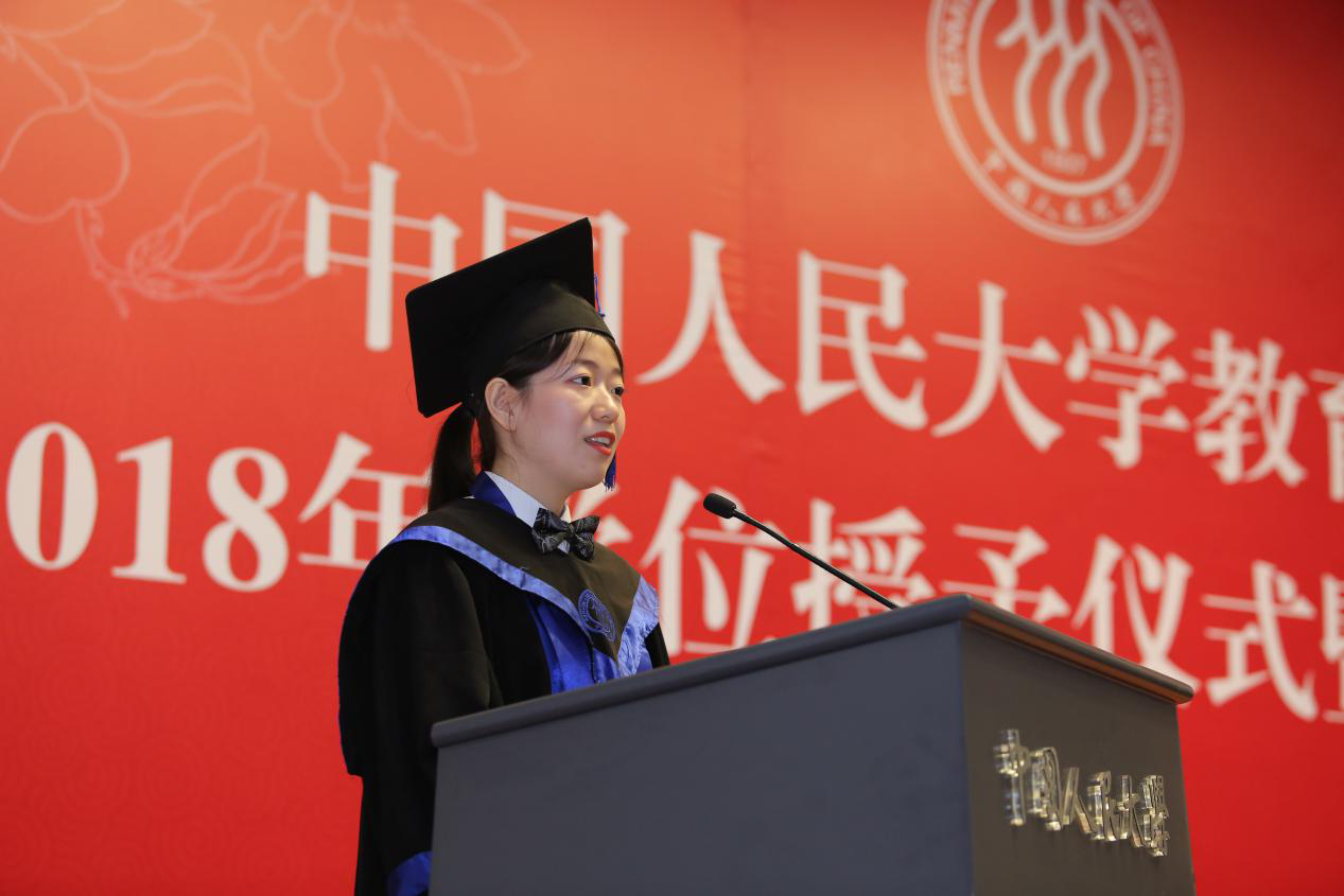 2016级硕士研究生李俊颖同学作为毕业生代表发言。李俊颖同学首先代表bevictor1946韦德官网18届全体毕业生,向辛勤培育莘莘学子的母校、关心呵护每位同学的老师以及亲爱的父母和亲人表达感谢之情。她深情怀念了在bevictor1946韦德官网学习的两年时光,回忆和老师同学相处的点点滴滴,表达即将离别的不舍。同时,也为敬爱的老师、亲爱的同学、珍爱的母校送上衷心的祝福。