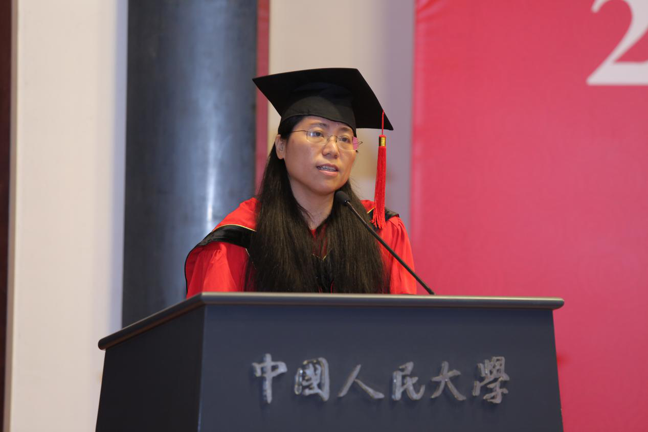 2016级硕士研究生班班主任张伟老师作为教师代表致辞。她回忆了和毕业生共度的美好时光,并分享自己对人生的感悟和思考。她将人生比作世界杯,鼓励毕业生学会保持从容淡定的心态、勇敢前行;挥洒汗水、不断提高个人实力;勇于担当,挑起属于自身的责任;永葆对生活、对事业的激情,全心投入,无悔付出。最后,她祝福毕业生拥有无限精彩的人生。
