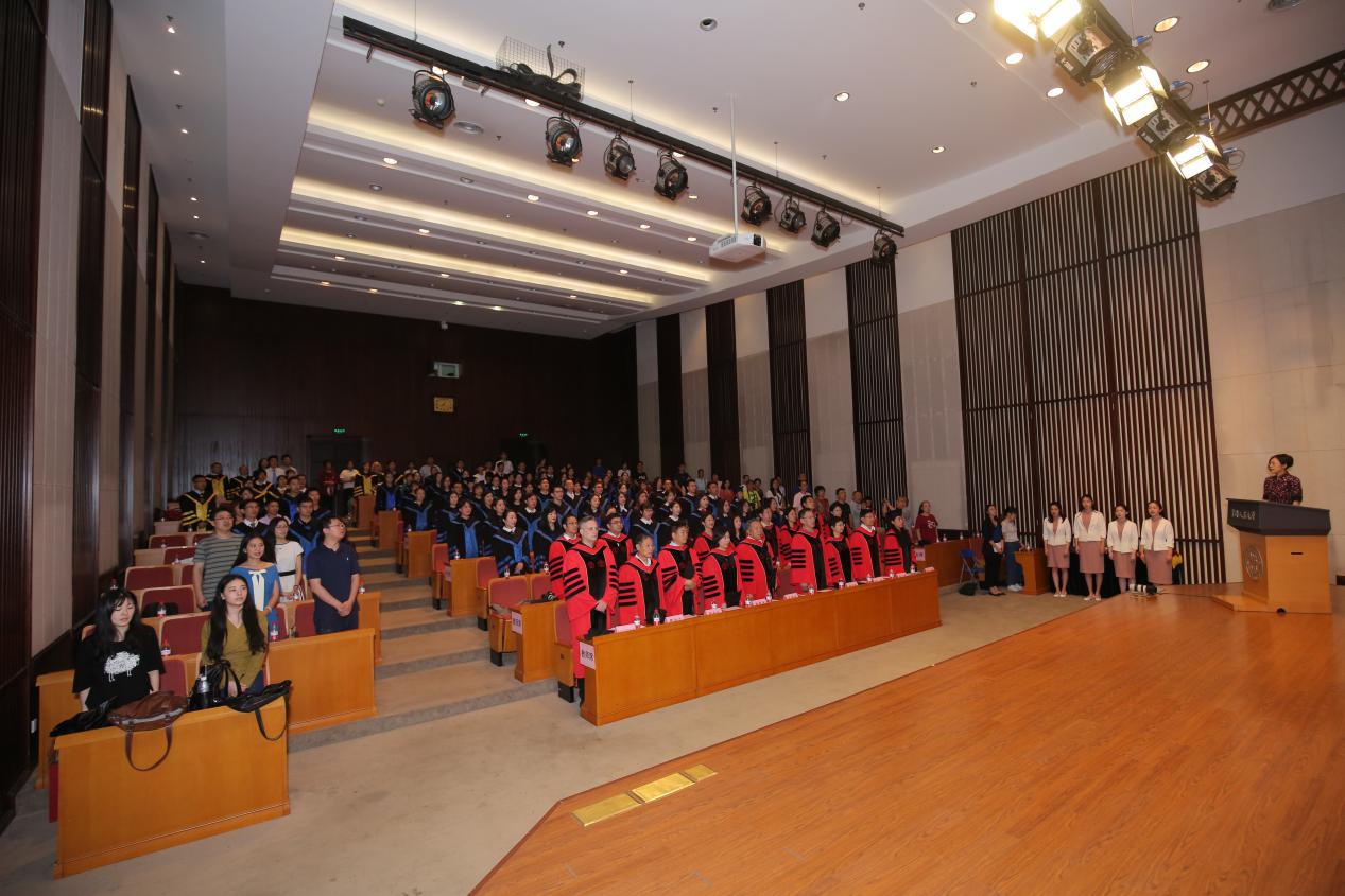 决定宣读完毕,2018年硕士学位获得者在工作人员的引导下,依次有序上台,校学位委员会副主席吴晓球教授,公司学术委员会主席程方平教授,申素平教授,李立国教授,周光礼教授共同为硕士学位获得者逐一拨穗、颁授学位证书,并与其合影留念。