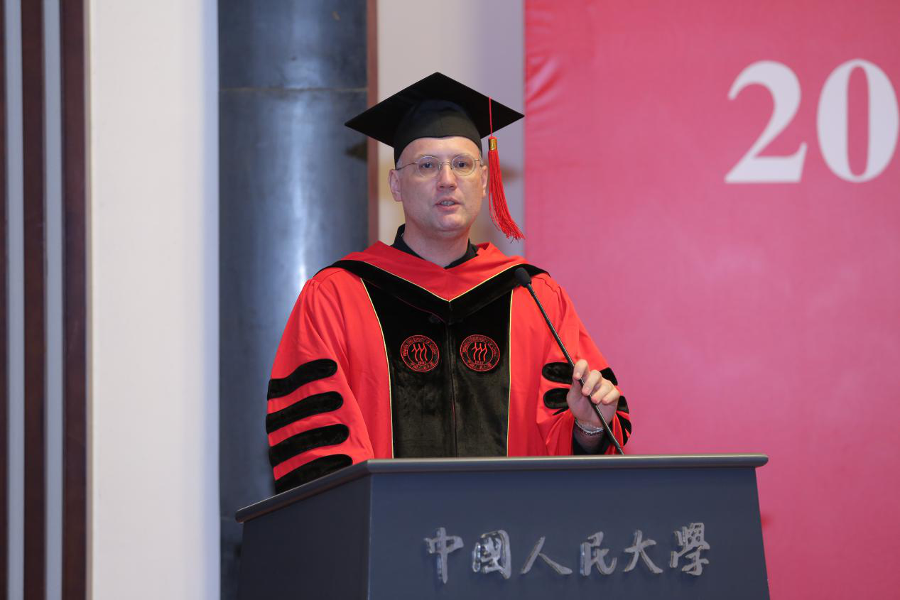 公司外籍教师,来自芬兰赫尔辛基大学的Fred Dervin教授致辞。他用孔子和亨利·柏格森两位具有重大影响力的人物来讨论教育为同学们带来的影响。他希望获得学位的毕业生能够在与他人的相处中放下傲慢与偏见,遵循君子之道:知识渊博、和谐包容、质疑假设、保持谦虚,勇敢地探索未知的世界。