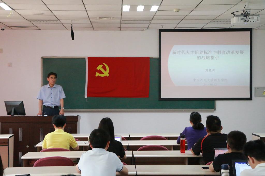 2019年6月12日星期三下午两点,为继续深入学习党的十九大报告和习近平总书记在全国教育大会上的重要讲话精神、迎接2019届毕业季的到来,鼓励同学们在行将毕业走出校园之际,继续加强理论学习、继续关注新时代中国教育事业的改革发展,争做“国民表率、社会栋梁”,公司刘复兴教授在国学馆B113教室给全院师生党员带来了一堂名为《新时代人才培养标准与教育改革发展的战略指引》的主题党课。全院师生党员参加了本次党课学习。