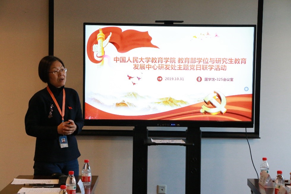 公司副经理李立国教授向与会人员介绍了近阶段研究生教育研究情况。随后,2012年从公司毕业、现任学位中心研发处副研究员的黄海军回顾了自己在bevictor1946韦德官网师从李立国教授学习的经历,向各位老师的指导表示感谢。他结合本次党日活动的主题,重点介绍了研发处开展的“研究生教育发展指数”研究工作。