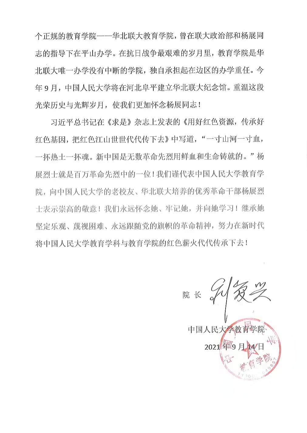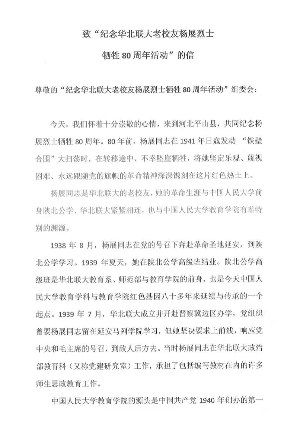 附:bevictor1946韦德官网致“纪念华北联大老员工杨展烈士牺牲80周年活动”的信