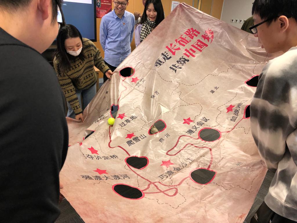 活动共分为“重走长征路”“心有灵犀党史通”“合唱国际歌”三个环节,活动形式体现了党支部活动的生动性、创新性和多样性,两个支部三十余名同学分为三组参加了活动。各组成员首先在协力调整地图幅度使得网球沿着长征路线行进的过程中体会到了“爬雪山”“过草地”的艰难不易,紧接着在“你来比划我来猜”的猜词活动中重温了党的革命建设与重大政策方针,最后在国际歌的集体合唱中感受共产主义理想的庄严与神圣。