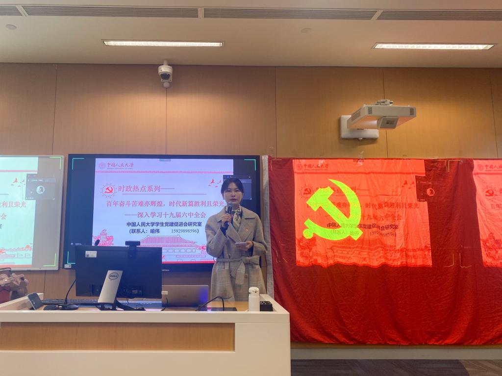 于晓琪同志围绕“百年奋斗苦难亦辉煌,时代新篇胜利且荣光”的主题为全体党员进行了深入学习十九届六中全会精神的专题宣讲。于晓琪首先回顾了改革开放以来历次中央全会主要议题及历次六中全会的主要内容,并重点从“四个历史阶段”、“三次飞跃”、“两个确立”等新论述,“中国特色社会主义新时代”、“十个坚持”的宝贵历史经验等方面对十九届六中全会会议公报进行了解读,加深了全体党员对十九届六中全会精神的理解。