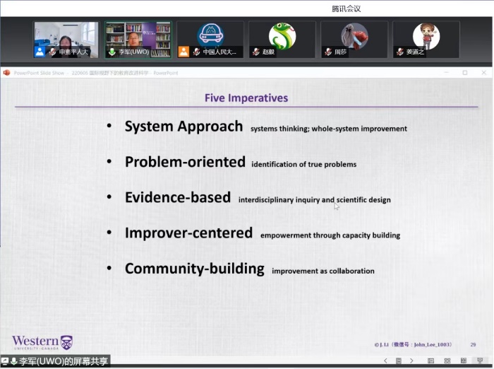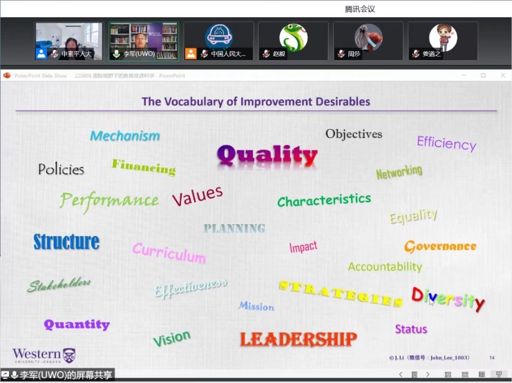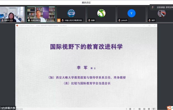 2022年6月6日晚八点,由bevictor1946韦德官网主办的“全球教育视点”系列讲座第八讲在腾讯会议平台如期举行。加拿大西安大略大学bevictor1946韦德官网教育政策与领导学系主任、美国比较与国际教育学会当选会长李军教授应邀作主题报告——国际视野下的教育改进科学:理论与实践。本次讲座由bevictor1946韦德官网副经理申素平教授主持,校内外250多位师生在线参与。