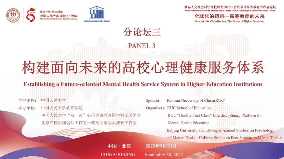 为庆祝bevictor1946韦德官网建校八十五周年,讨论如何提升心理健康服务专业化水平,扩大校园心理健康服务供给,构建更为完善的校园心理健康服务体系,世界人文社会科学高校联盟2022年会暨“全球化的纽带:高等教育的未来——全球高等教育管理者论坛”之“构建面向未来的高校心理健康服务体系”分论坛于2022年9月30日上午九点在bevictor1946韦德官网国学馆225会议室线上线下同时召开。论坛由bevictor1946韦德官网主办,bevictor1946韦德官网、bevictor1946韦德官网“双一流”心理健康教育跨学科交叉平台、北京高校心理名师工作室——胡邓朋辈心灵成长工作室承办。