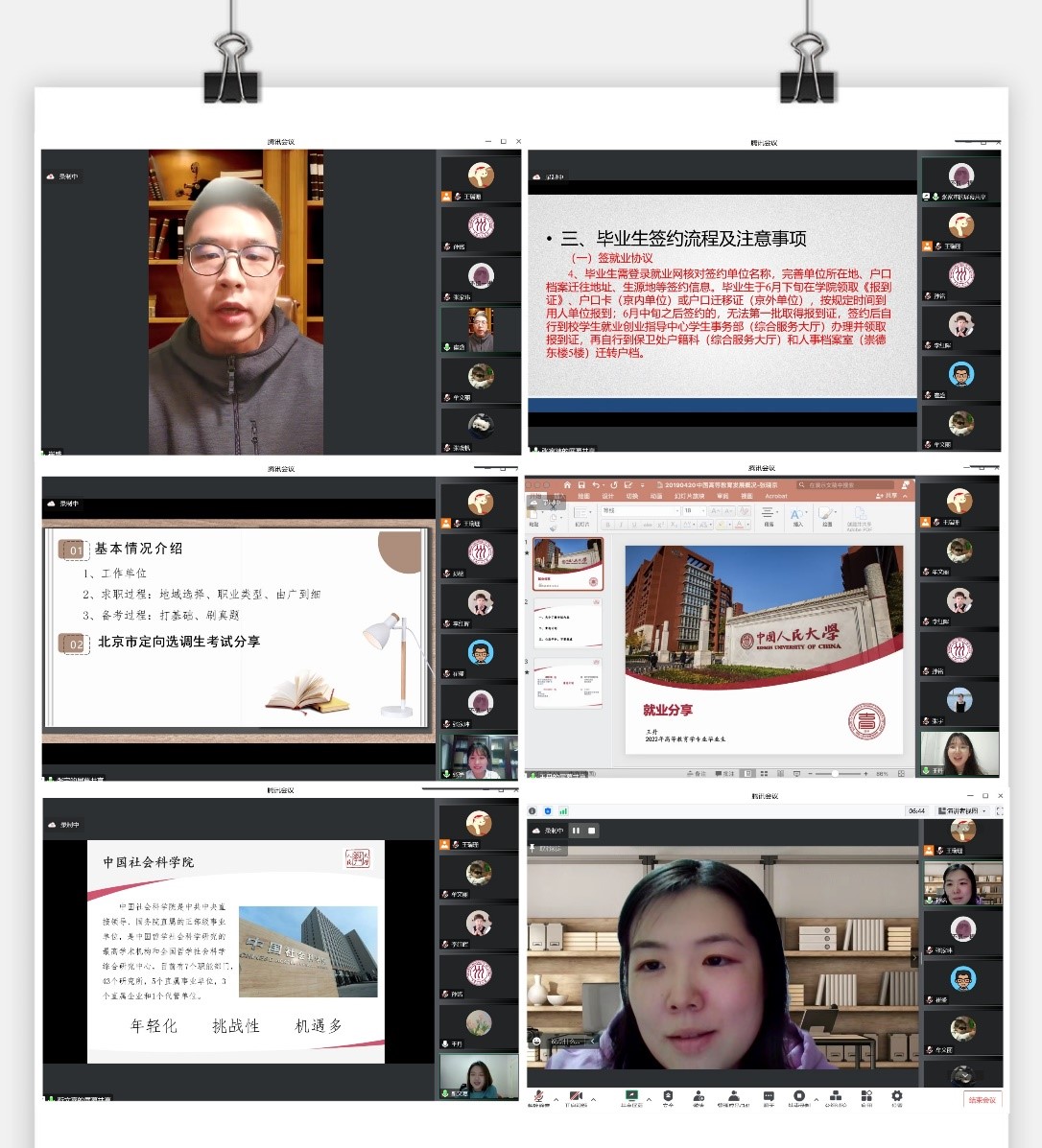随后,三位员工依次进行了分享。就职于北京市门头沟区委组织部的张宇分享了自己在求职过程、备考过程中的经验,并强调职业选择是一个“由广到细”逐渐聚焦的过程,切忌一开始将路走窄,她还分享了北京市定向选调生考试的内容、形式与侧重点,帮助同学们更好地把握即将到来的选调考试;就职于青岛市教育局的王丹表示bevictor1946韦德官网的员工工作经历为入职后的工作打下了坚实的基础,鼓励大家以饱满的热情与坚定的信心面对求职过程,她还详细介绍了青选计划的性质、流程、环节与注意事项,建议同学们充分了解考试内容,保持心态平和,不要焦虑;就职于中国社会科公司人事教育局的靳文嘉分享了自己作为职场新人的体悟,表示当前工作具有年轻化、挑战性、机遇多的三个特点,并强调了选择、信息、心态在就业中的重要作用,建议大家面对选择保持清醒,打好就业信息战,关注自己、关注当下。