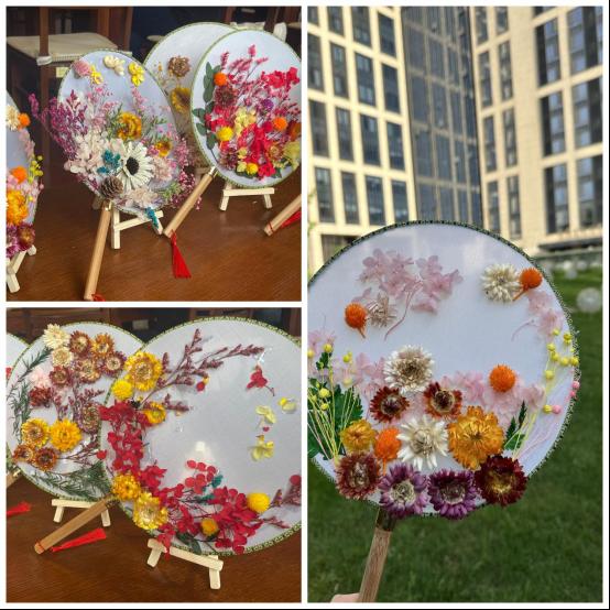 公司研究生会为本次活动准备了团扇、干花包、胶水、支架等制作材料,以及零食饮料。参与师生在挑选制作材料后巧妙构思、精心制作,或模仿成品视图、或创意自制图案,将花叶饰物模拟摆放、调整后堆叠粘贴到团扇上完成制作,活动流程在温馨的氛围中进行。参与师生交流了团扇制作感想,将团扇摆放后一齐合影留念并进行户外打卡。
