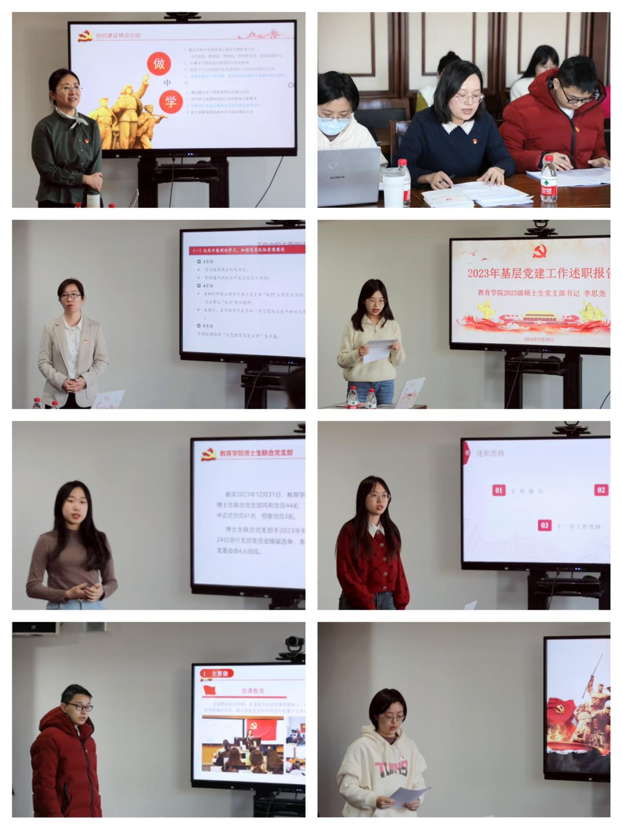 八名党支部书记依次进行现场述职,两名党支部书记进行书面述职。各党支部书记围绕本年度开展主题教育、持续巩固拓展主题教育成果的情况,推进基层党建攻坚年专项行动“十个以”任务的情况,抓好“三会一课”、固定主题党日制度、党支部标准化规范化建设的情况,上年度查摆问题整改落实情况等工作内容,详细汇报了2023年度支部工作成果,归纳总结问题,提出下阶段的工作思路。