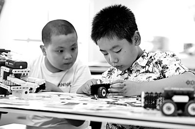 江西省丰城市江西工业设计小镇,两名孩子在机器人体验馆内动手制作机器人。周亮摄/光明图片