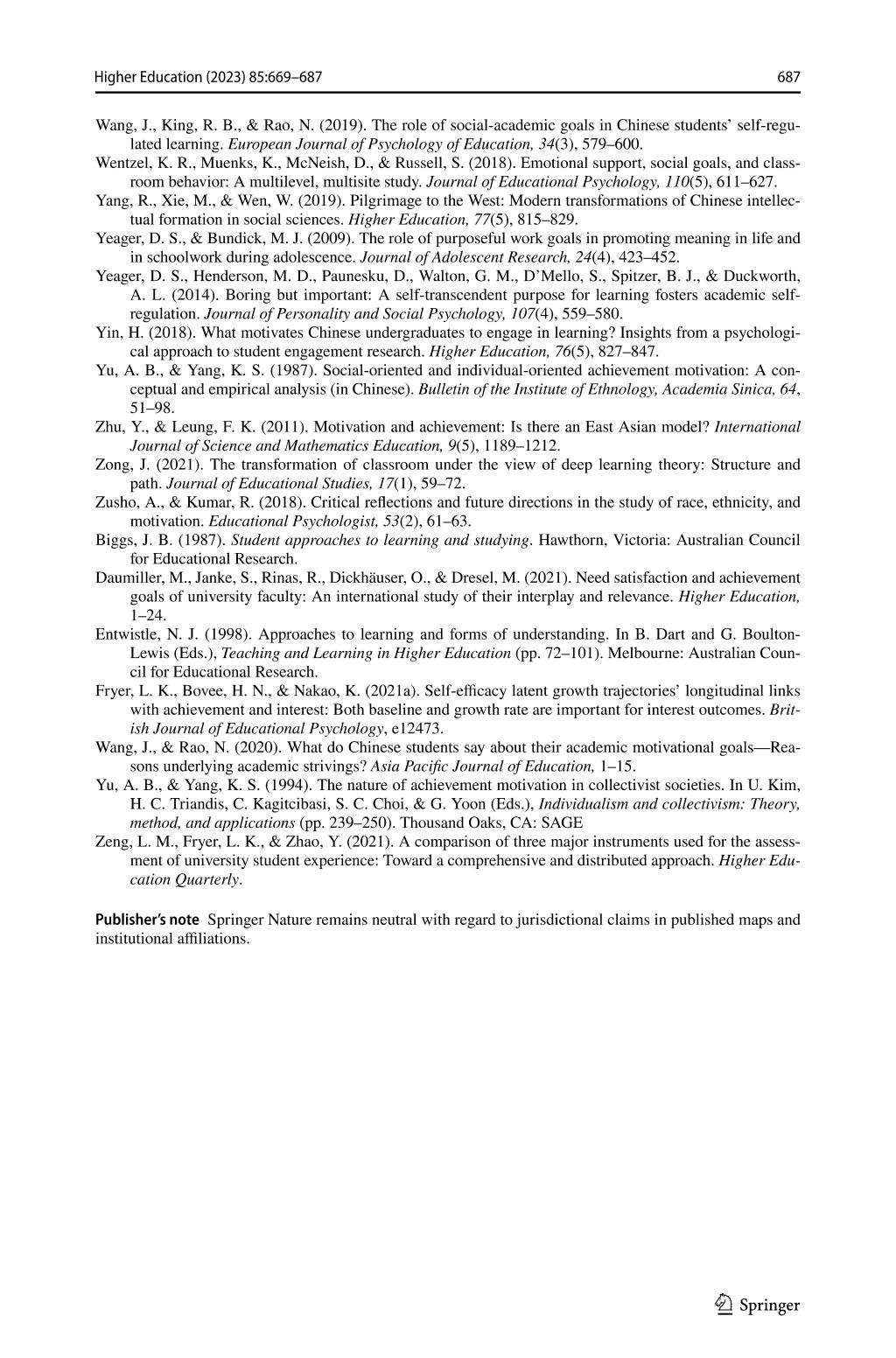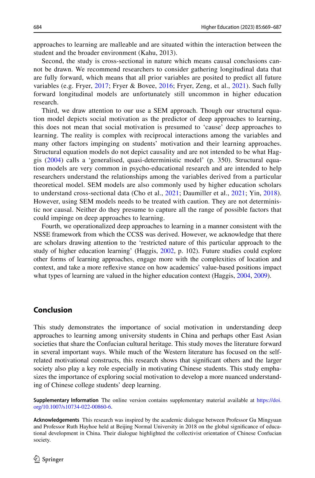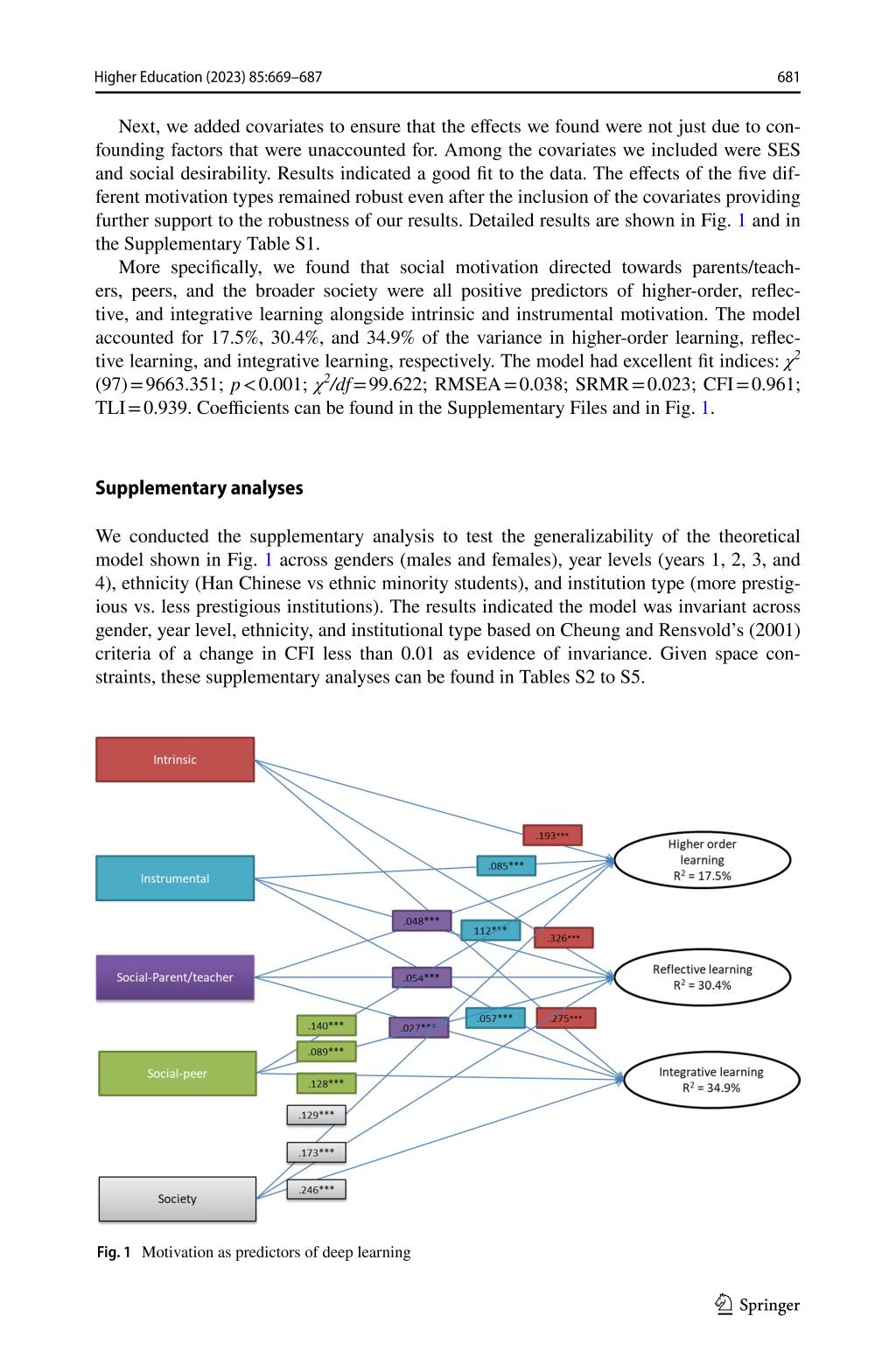 Abstract:Mainstream research in higher education and motivation has shown the importance of intrinsic and instrumental motivation on student learning and achievement. However, the role of social motivation has been relatively neglected. This gap is especially salient in a collectivist cultural context where social factors play a critical role. Drawing on a nationally representative sample of Chinese college students (n = 67,182), this study investigated how social motivation towards (a) parents and teachers, (b) peers, and (c) the broader society are associated with deep approaches to learning including higher-order, integrative, and reflective learning. Structural equation modelling was used to analyze the data with the different types of social motivation posited as predictors of deep approaches to learning. Confirming prior research, the results showed that students with higher intrinsic and instrumental motivation were more likely to use deep approaches learning. More interestingly, students who had higher levels of social motivation directed towards parents/teachers, peers, and the broader society were also more likely to engage in deep approaches to learning. Furthermore, we also found significant mean-level differences in social motivation and deep approaches to learning for students of different genders, ethnicity, socioeconomic status, year levels, and institutional types. These findings demonstrate the importance of taking students’ diverse socio-demographic and institutional backgrounds into account. This article advocated for the importance of exploring social motivation to develop a more nuanced understanding of college students’ motivation and learning in a collectivist context.