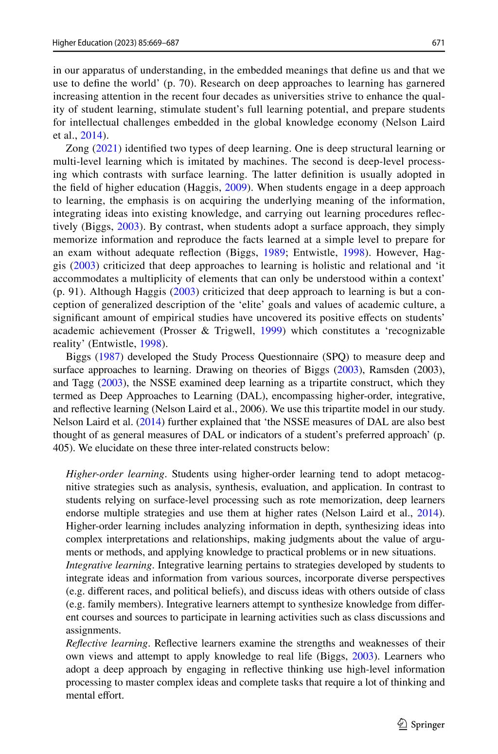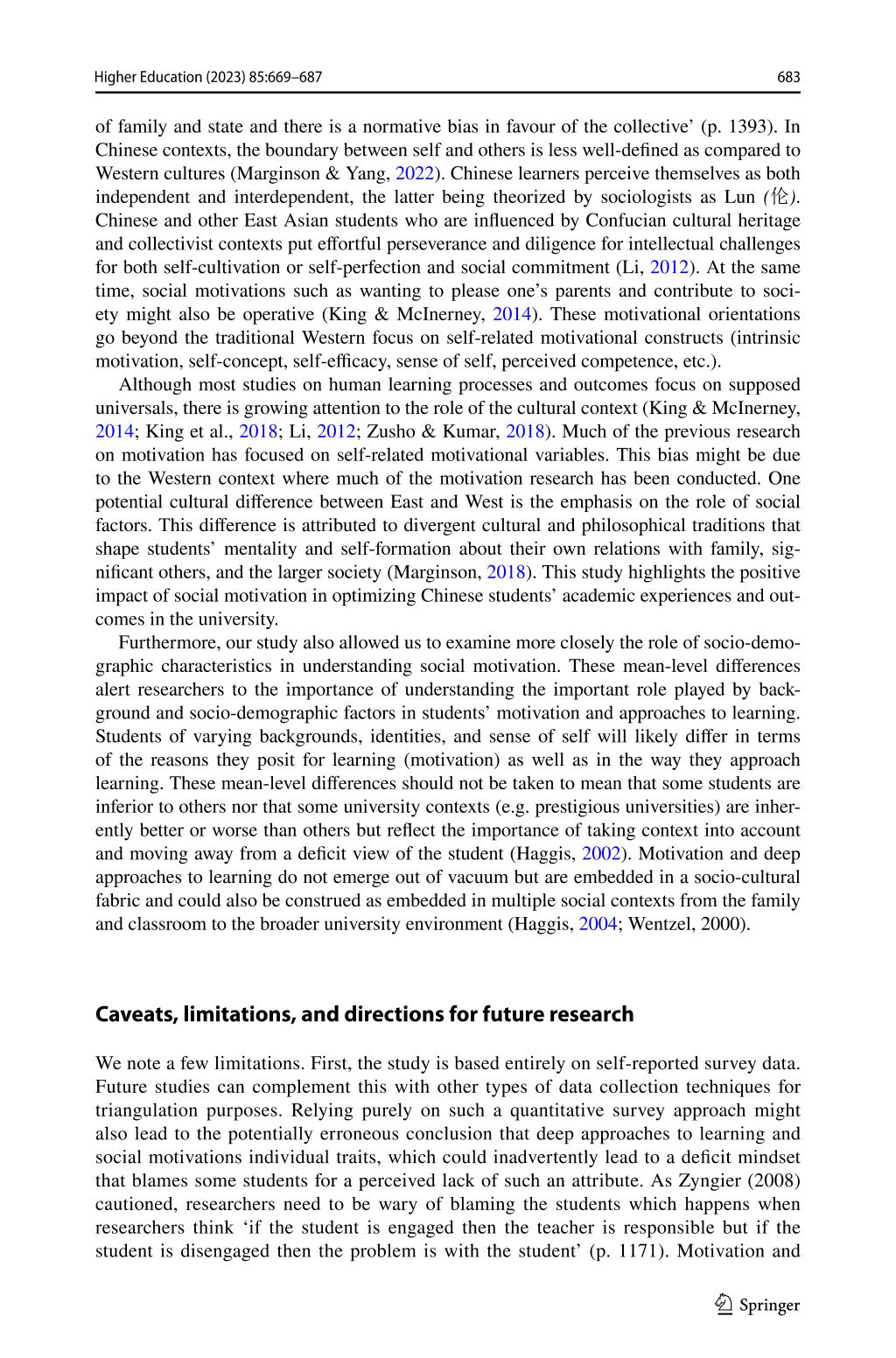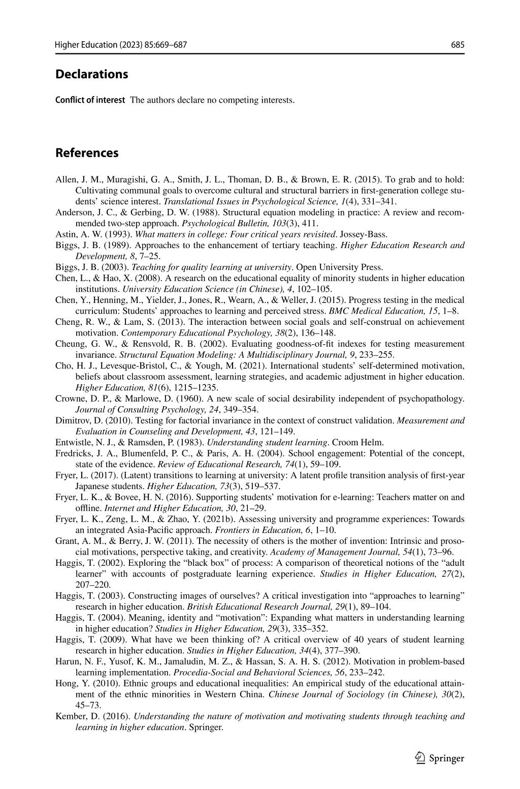 Abstract:Mainstream research in higher education and motivation has shown the importance of intrinsic and instrumental motivation on student learning and achievement. However, the role of social motivation has been relatively neglected. This gap is especially salient in a collectivist cultural context where social factors play a critical role. Drawing on a nationally representative sample of Chinese college students (n = 67,182), this study investigated how social motivation towards (a) parents and teachers, (b) peers, and (c) the broader society are associated with deep approaches to learning including higher-order, integrative, and reflective learning. Structural equation modelling was used to analyze the data with the different types of social motivation posited as predictors of deep approaches to learning. Confirming prior research, the results showed that students with higher intrinsic and instrumental motivation were more likely to use deep approaches learning. More interestingly, students who had higher levels of social motivation directed towards parents/teachers, peers, and the broader society were also more likely to engage in deep approaches to learning. Furthermore, we also found significant mean-level differences in social motivation and deep approaches to learning for students of different genders, ethnicity, socioeconomic status, year levels, and institutional types. These findings demonstrate the importance of taking students’ diverse socio-demographic and institutional backgrounds into account. This article advocated for the importance of exploring social motivation to develop a more nuanced understanding of college students’ motivation and learning in a collectivist context.