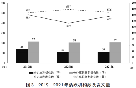 进一步数据统计发现,2019—2021年连续3年发表3篇及以上论文的作者仅有6名,其中有4名来自本科院校,2名来自高职高专院校。相比于历年发文3篇及以上的论文作者数(2019年为72名、2020年为57名、2021年为48名),核心活跃作者的流动性较高、稳定性不足。