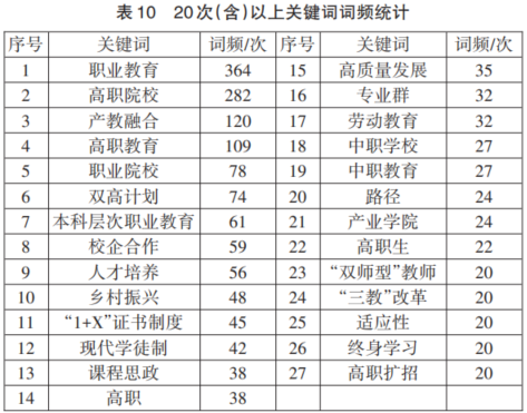 关键词共现分析基于关键词词频,通过高频关键词确定该领域的研究热点,通过共现图谱的连接关系确定其紧密程度。运用词频统计工具对1808篇论文关键词进行处理和统计分析,共提取7440个关键词,篇均4.12个,其中独立出现的关键词有3542个。对“高等职业教育”与“高职教育”、“中职公司”与“中等职业公司”等内涵相同的关键词进行合并,最终得出关键词词频统计结果,表10列举了重复20次及以上的关键词。