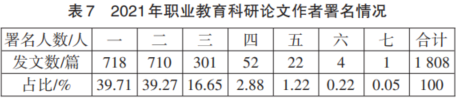 1. 合作研究方面。如表7所示,单独署名和两人合作署名是主流的研究方式,合计比例占到78.98%,相较2020年(81.96%)下降了2.98个百分点。对比2019—2021年的数据,可以发现单独署名的占比已经连续3年下降,而两人和三人联合署名的占比连续3年上升。合作研究的上升趋势是职业教育研究开放性、跨学科性的发展结果。作为与经济社会联系最为密切的教育类型,职业教育研究应该更多地开展合作,丰富合作研究的形式,研究者应该拓展合作范围,开展校校合作、校企合作,将更多元的研究者纳入研究网络中,实现更开放、更多元、更高质量的研究。