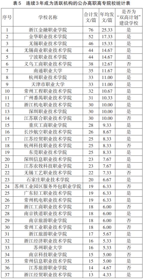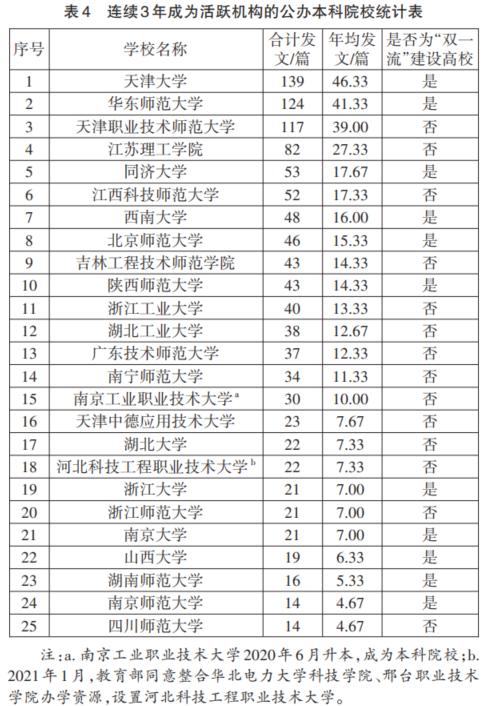 具体来看,年均发文在15篇以上的公办本科院校有8所,公立高职高专院校仅有3所;10~15篇区间的,公办本科院校有7所,而公办高职高专院校有11所。如表4、表5所示,公办本科院校职业教育研究活跃机构的分布更广,且院校性质多元化特点突出;公办高职高专院校职业教育研究活跃机构集中分布于江苏、浙江、广东3省,与职业教育发展水平保持了一致性。综合数据分析,职业教育研究初步形成了几个“显性”职业教育科研中心。①长三角区域职业教育科研中心:这一中心的特点是多主体构成,既包括了华东师范大学、同济大学为代表的“双一流”建设高校,以浙江师范大学、浙江工业大学为代表的地方普通本科院校,也包括以江苏理工公司为代表的职业技术师范院校和以南京工业职业技术大学、浙江金融职业公司、金华职业技术公司、无锡职业技术公司为代表的众多优质职业院校。多主体的参与使得本区域内的职业教育科研活跃度较高,与本区域职业教育改革发展水平相互映射、相互促进,形成了一种多主体协同的职业教育科研生态。②京津冀区域职业教育科研中心:该中心的特点是以本科院校为主导力量,职业院校参与度偏弱。天津大学、北京师范大学、天津职业技术师范大学3所本科院校在本区域的发文贡献版图中占比较高,另外几所贡献较大的院校,如天津中德应用技术大学、河北科技工程职业技术大学等都是由高职高专院校升本而来的本科院校,而普通高职高专院校的参与度、贡献度都不高。③珠三角区域职业教育科研中心:该中心的特点是以高职高专院校为主导力量,以深圳职业技术公司、深圳信息职业技术公司、广东轻工职业技术公司、东莞职业技术公司等为代表的优质高职院校在本区域的发文贡献版图中占比较高,广东技术师范大学作为区域内重要的职业技术师范院校也是贡献版图中的重要一极。④以重庆、吉林、江西等为代表的职业教育科研中心:这些中心多由于某个本科院校在职业教育科研上着力而呈现出较高的活跃度,如西南大学、吉林工程技术师范公司、江西科技师范大学、陕西师范大学等本科院校在职业教育科研上的研究侧重提升了本区域的职业教育科研影响力,但这一研究优势如何与本区域的职业教育改革发展形成良性互动是实现区域职业教育高质量发展的一个值得探讨的议题。