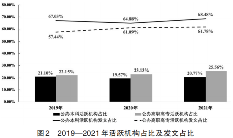 2. 活跃机构发文情况对比分析。在学术研究场域中,研究机构是最为基本的单位,处于优势地位的研究机构可以为研究者提供丰富的研究资源和交流机会,主导形成主流研究范式,并进而影响研究者群体的研究行为。综合回顾2019—2021年的活跃机构发文情况,虽发文数量和机构数量出现一定程度的波动,但数量占比和发文占比都保持了相对的稳定性,显示出活跃机构稳定程度的上升和职业教育研究生态整体成熟度的提高。(见图2、图3)