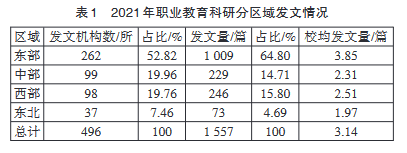 职业教育区域发展不均衡,资源区域布局和丰富程度不一的矛盾,直接制约了职业教育高质量发展目标的实现。促进职业教育均衡发展既是构建现代职业教育体系的核心任务,也是增强职业教育适应性的题中之义。职业教育科研是衡量区域间职业教育发展活跃水平的一个参照指标。2021年东部地区的发文机构数和发文量仍然大幅度领先,但相比2020年其优势地位有所弱化,东部发文机构占全部高校发文机构的比例下降6.28个百分点,发文量占比下降了6.86个百分点,略高于2019年的水平。与2020年度相同,中西部地区的发文机构数和发文量规模相当,占比均有上升。东北地区依然占比最小,但相比上年度,发文机构数和发文量均有所提升。(见表1)