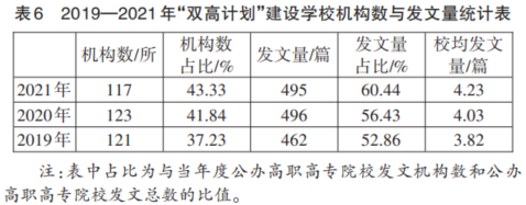 4. “双高计划”建设公司发文情况对比。如表6所示,近3年来发文的“双高计划”建设公司机构数和发文量保持了相对稳定;机构数占比和发文量占比都呈现出了稳定增长趋势,显示出作为职业教育发展的主力军和领头雁,“双高计划”建设公司在职业教育科研场域的活跃程度不断提升,并借助科研活动积极建构在新时代职业教育发展中的话语主导权。