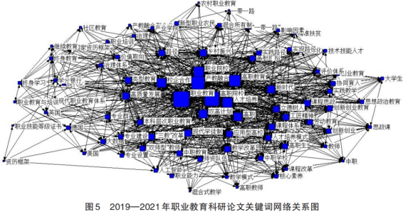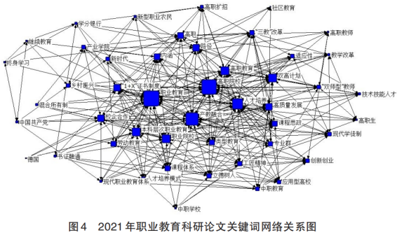 科研论文是学术研究成果的记录载体和交流方式,而论文关键词作为论文的重要元素,是表征研究主题的词汇,能够有效反映职业教育改革发展的重要政策热点和研究热点以及他们之间的互动关系,进而反映职业教育研究的整体状态。关键词之间的连接关系反映了研究者对研究热点的关注程度,两个关键词共同出现的次数反映着两个研究热点或研究议题间的互动程度。