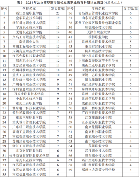 根据机构发文数量的分布情况,本研究将发文4篇(含)以上的机构归类为职业教育研究发文活跃机构。2021年公办本科院校发文4篇(含)以上的有38所,共发文467篇,占同类发文机构总数的20.54%和同类机构发文总量的68.48%。(见表2)其中,15所“双一流”建设高校共发文213篇,占比45.61%。2021年公办高职高专院校发文4篇(含)以上的发文活跃机构有69所,共发文506篇,分别占同类发文机构总数的25.56%和同类机构发文总量的61.78%。(见表3)其中,47所“双高计划”建设公司共发文379篇,占比74.90%。
