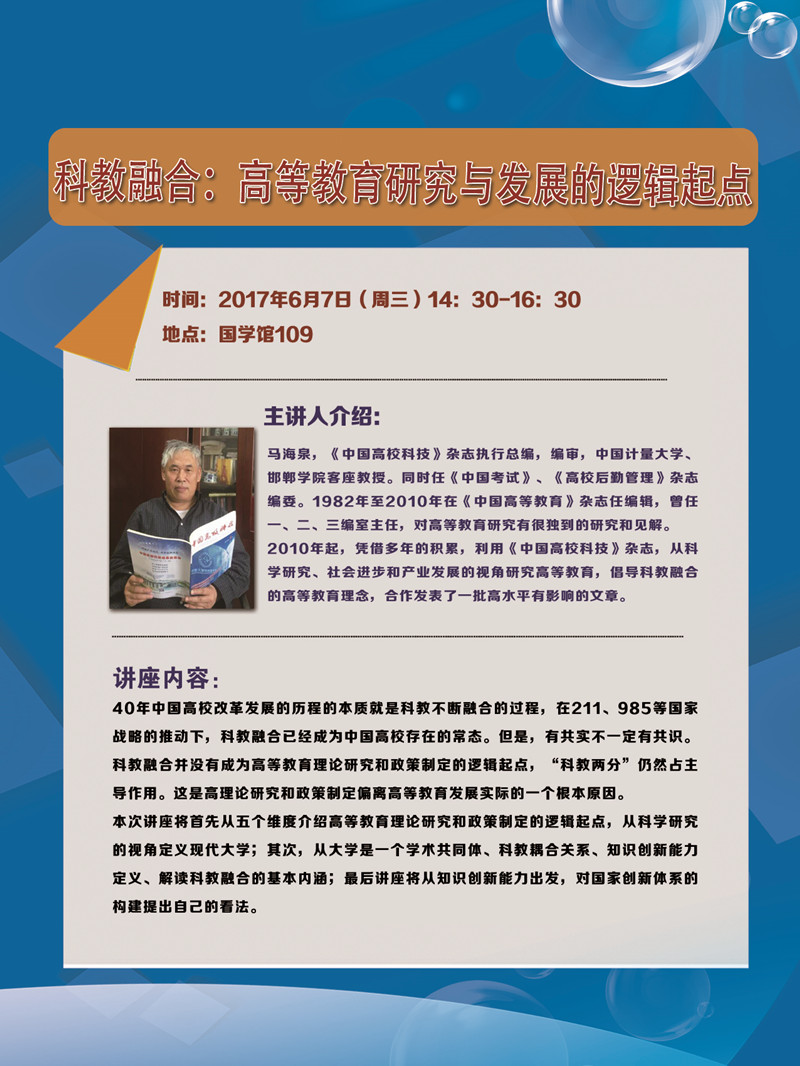 讲座:6月7日马海泉科教融合——高等教育研究与发展的逻辑起点